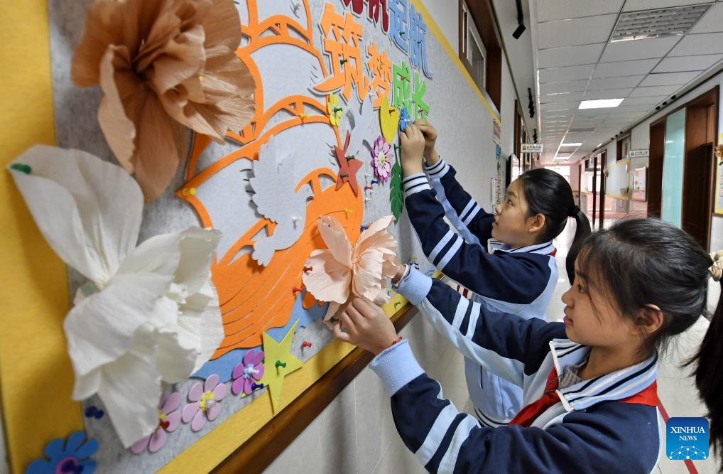 Students decorate a display board at a primary school in Dongcheng District of Beijing, capital of China, March 2, 2026. A new semester kicked off for primary and secondary schools in many parts of China on Monday. (Xinhua/Li Xin)