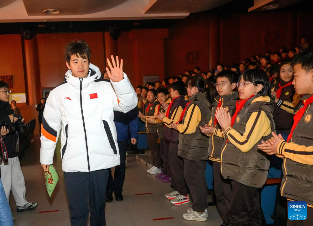China's Olympic champion Pan Zhanle greets students at a primary school in Beijing, capital of China, March 2, 2026. Pan was invited to give a lecture on physical and mental health on the first day of the new semester. A new semester kicked off for primary and secondary schools as well as kindergartens in many parts of China on Monday. (Xinhua/Jin Liangkuai)