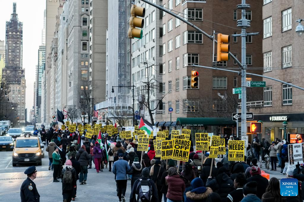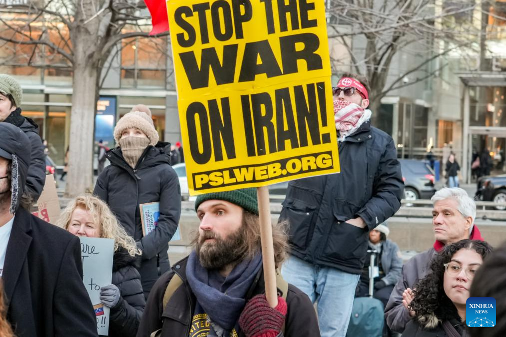 People protest against U.S. military attack on Iran in New York, the United States, on March 2, 2026. (Photo by Zack Zhang/Xinhua)