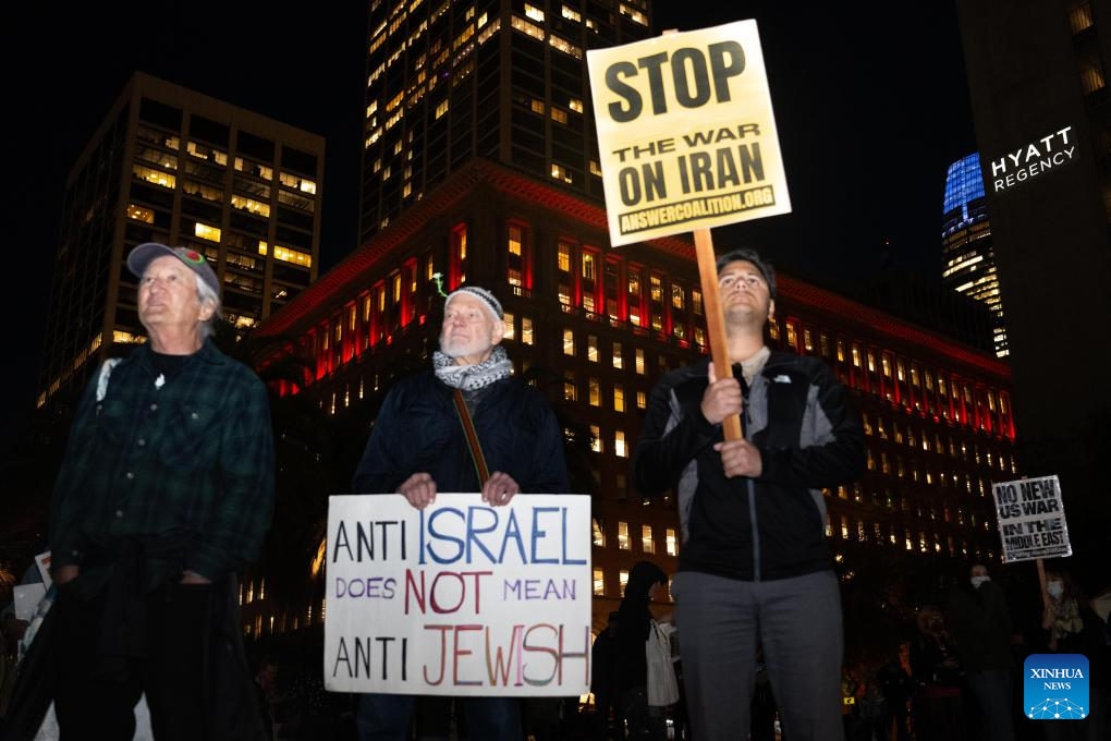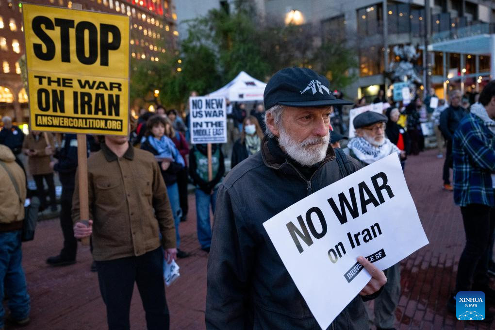 People protest against U.S. military attack on Iran in San Francisco, the United States, on March 2, 2026. (Photo by Ziyu Julian Zhu/Xinhua)