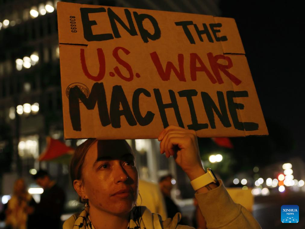People protest against U.S. military attack on Iran in Los Angeles, the United States, on March 2, 2026. (Xinhua)