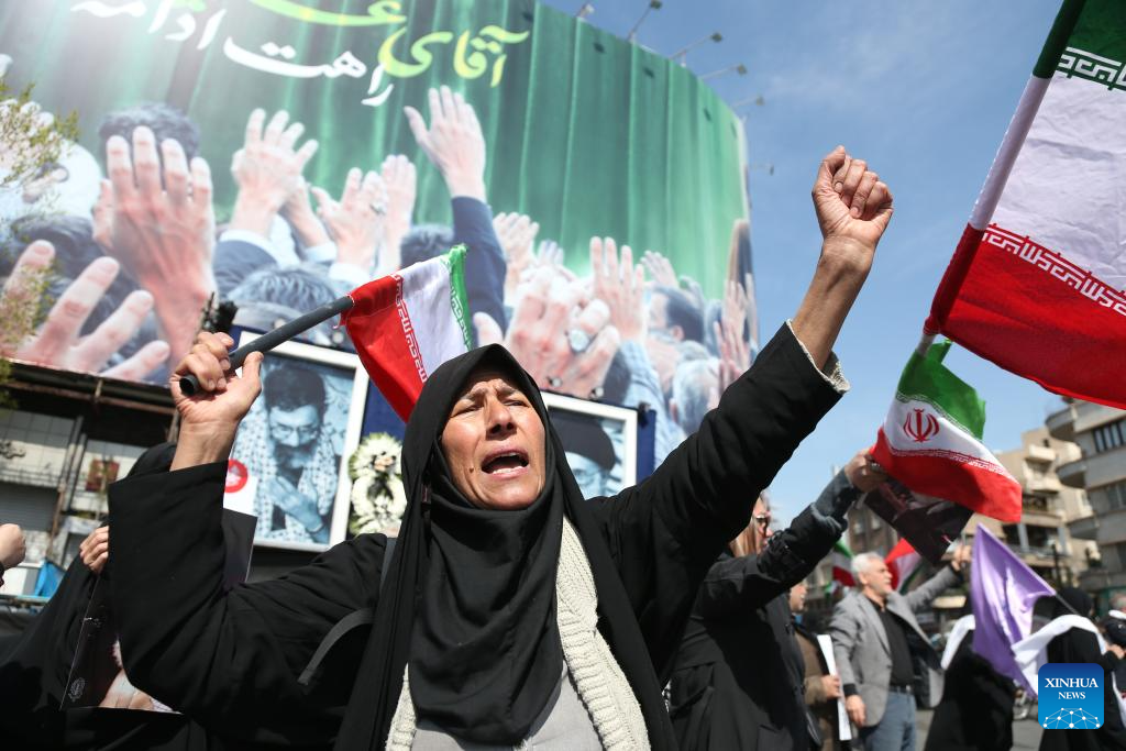 People protest against U.S. and Israeli military attacks on Iran in Tehran, Iran, on March 4, 2026. (Xinhua/Shadati)