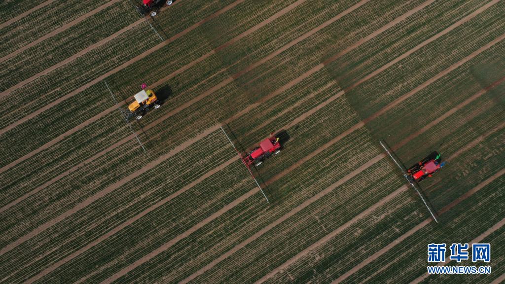 噴霧機在河北省辛集市試炮營村麥田里進行除草作業(yè)(2020年3月17日攝,無人機照片)。