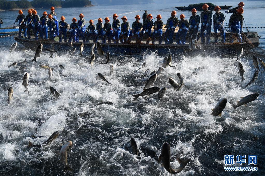 捕撈隊員在千島湖進行巨網(wǎng)捕魚(2018年11月28日攝)。近年來,千島湖以漁業(yè)為基礎,建立了集“養(yǎng)殖、管護、捕撈、銷售、加工、烹飪、旅游、文創(chuàng)”為一體的完整產業(yè)鏈,獲得經濟效益和生態(tài)效益的雙豐收。