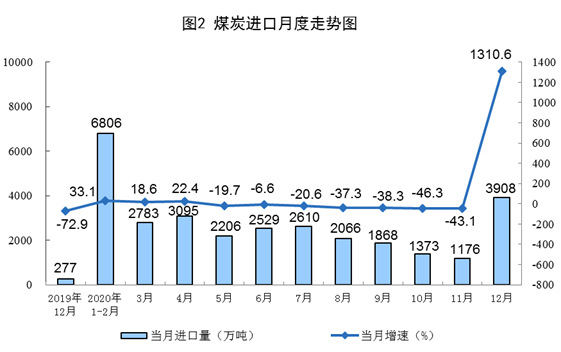 煤炭進口增加。12月份,進口煤炭3908萬噸,環(huán)比增加2732萬噸。2020年,進口煤炭3.04億噸,比上年增長1.5%。