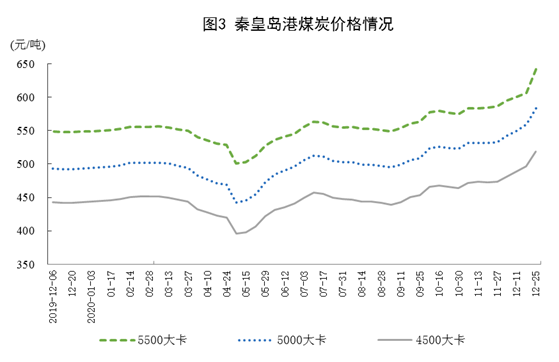港口煤炭綜合交易價格上漲。1225日,秦皇島港5500大卡、5000大卡和4500大卡動力煤綜合交易價格分別為每噸642元、583元和519元,比1127日分別上漲56元、50元和45元。