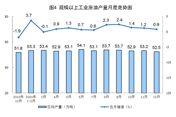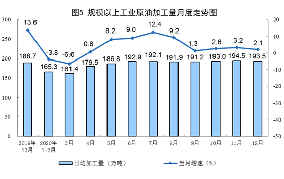 原油生產(chǎn)增速略有放緩。12月份,生產(chǎn)原油1627萬噸,同比增長0.9%,增速比上月回落0.3個百分點;日產(chǎn)52.5萬噸,環(huán)比減少0.7萬噸。加工原油6000萬噸,同比增長2.1%,比上月回落1.1個百分點。2020年,生產(chǎn)原油1.95億噸,比上年增長1.6%;加工原油6.7億噸,增長3.0%