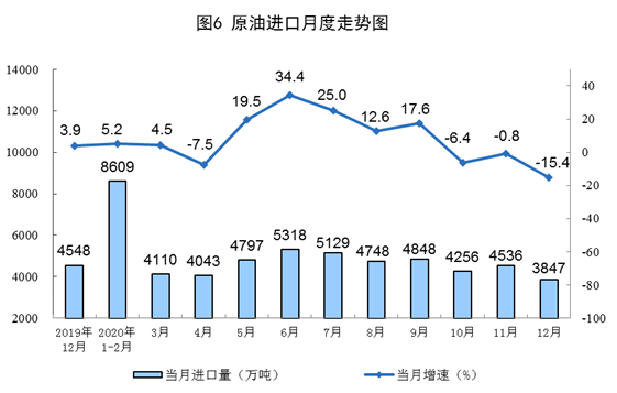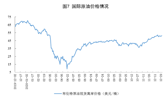 原油進口降幅擴大,國際原油價格繼續(xù)上漲。進口原油3847萬噸,環(huán)比減少689萬噸,同比下降15.4%,降幅比上月擴大14.6個百分點;2020年,進口原油5.4億噸,比上年增長7.3%。1231日,布倫特原油現(xiàn)貨離岸價格為51.22美元/桶,比1130日的46.84美元/桶上漲9.4%。