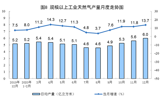 天然氣生產(chǎn)持續(xù)快速增長。12月份,生產(chǎn)天然氣187億立方米,同比增長13.7%,增速比上月加快1.9個百分點;日產(chǎn)6.0億立方米,環(huán)比增加0.4億立方米。2020年,生產(chǎn)天然氣1888億立方米,比上年增長9.8%,連續(xù)四年增產(chǎn)超過100億立方米。