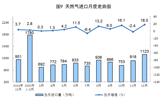 天然氣進口由降轉(zhuǎn)增。12月份,進口天然氣1123萬噸,同比增長18.0%,上月為下降2.4%2020年,進口天然氣1.02億噸,比上年增長5.3%。