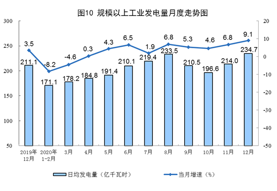 電力生產(chǎn)增速繼續(xù)加快。12月份,發(fā)電量7277億千瓦時,同比增長9.1%,增速比上月加快2.3個百分點;日均發(fā)電234.7億千瓦時,環(huán)比增加20.7億千瓦時。2020年,發(fā)電量74170億千瓦時,比上年增長2.7%。