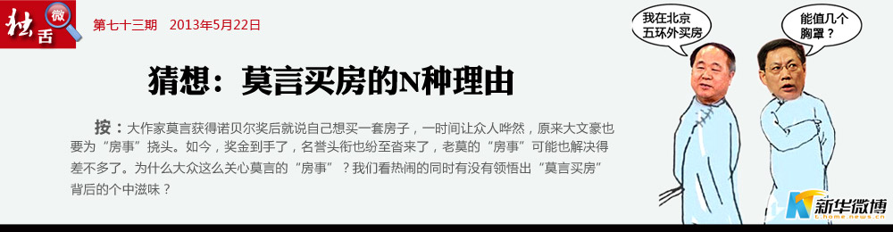 猜想二:安得廣廈五環(huán)外 安居才能樂(lè)業(yè),即便莫言用諾貝爾獎(jiǎng)金買房,也是可以理解的。一直以來(lái),文人的命運(yùn),往往與時(shí)代命運(yùn)息息相關(guān)。居高不下的房?jī)r(jià),卻是百姓之痛。