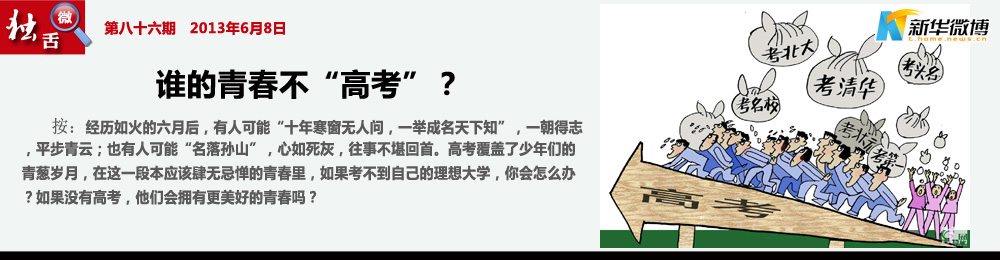 【為經(jīng)濟做貢獻】 算算高考,用了12年青春,至少四五十萬的學(xué)費,我們養(yǎng)活了晨光廠、真彩廠、機讀卡廠、無數(shù)造紙廠、無數(shù)印刷場,翰林書店、新華書店,城市的交通行業(yè),學(xué)校周邊的飯館,以及所有老師的工資獎金、校長的車、油錢……高考是國家支柱型民營企業(yè)!這就是我們的功勞!