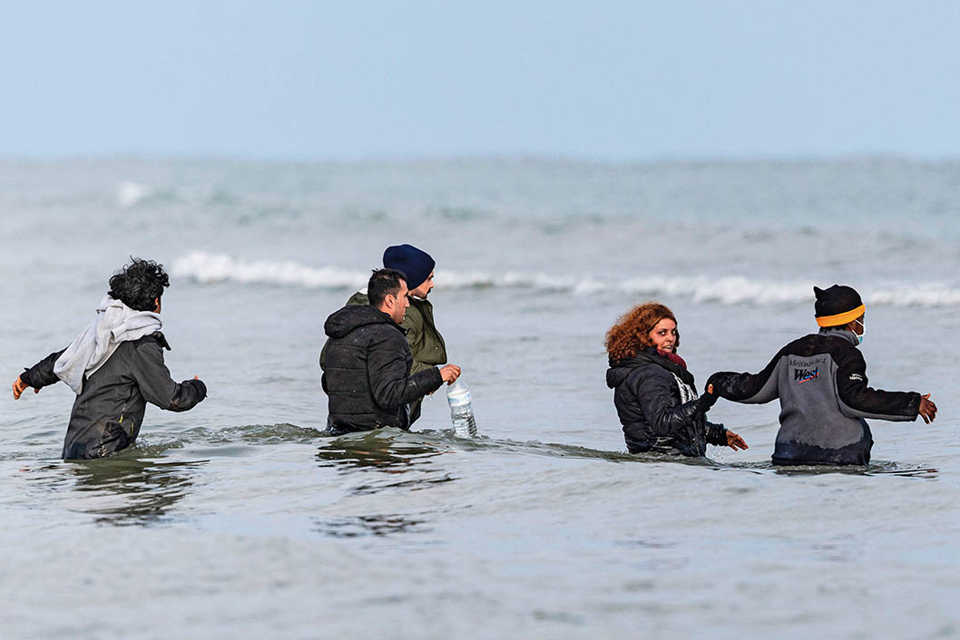 2024年4月26日,在法国北部敦刻尔克附近的格拉沃利讷海滩,移民走进大海准备乘橡皮舟渡海前往英国