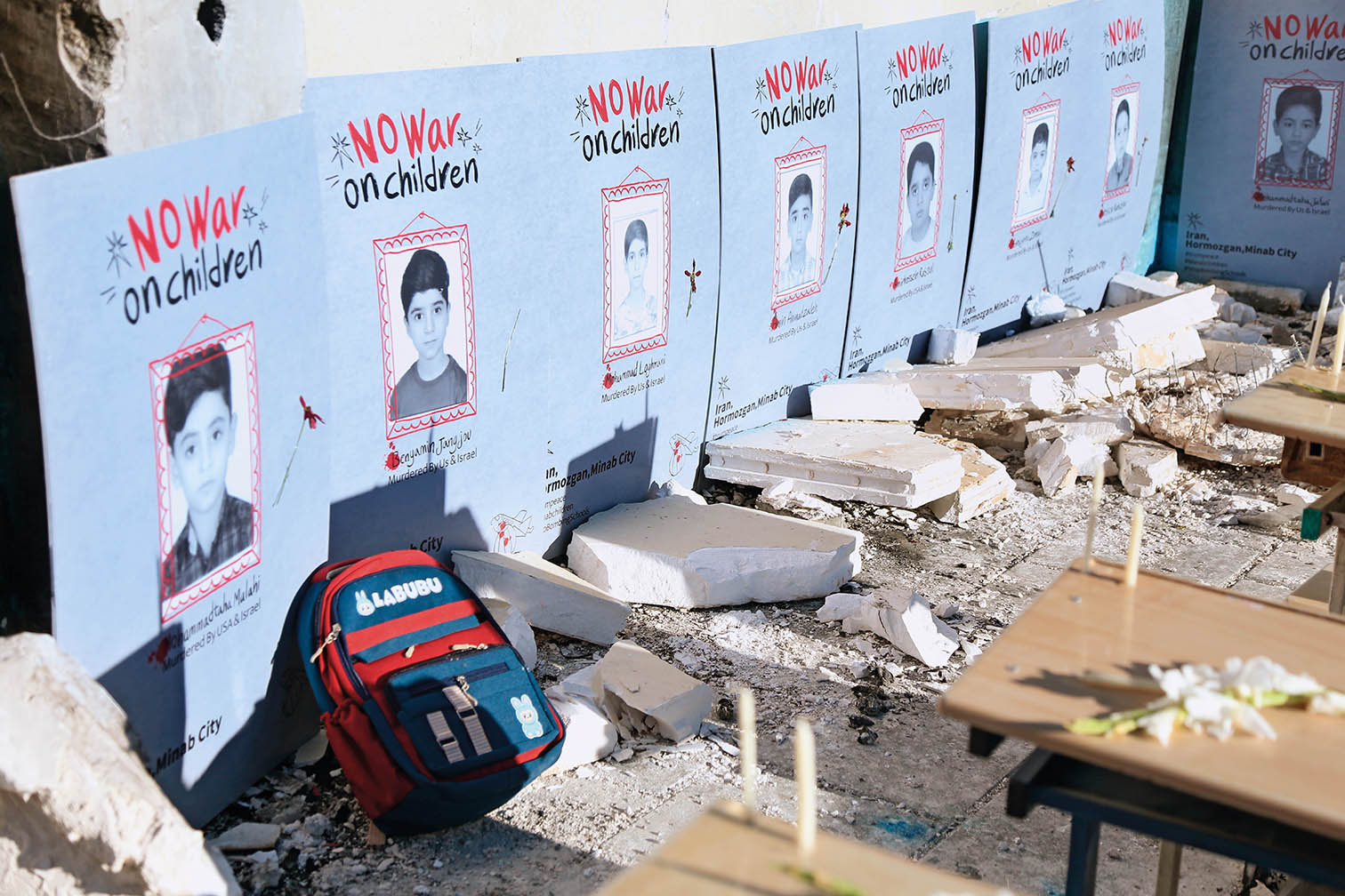 2026年 4月6日,在伊朗首都德黑兰市举行的悼念活动现场,组织者搭建起小学教室遭袭场景并摆放遇难儿童照片,悼念遭美以空袭遇难的米纳卜小学学生