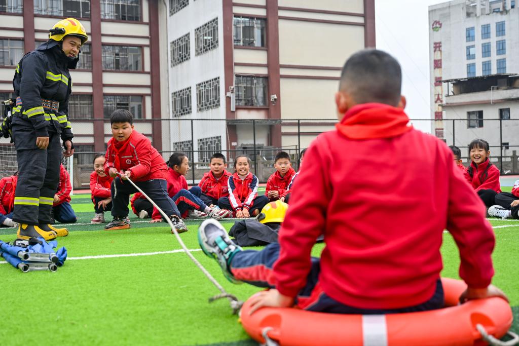 3月30日,消防员在贵州省开阳县第一小学指导学生演练溺水自救互救的基本技能。