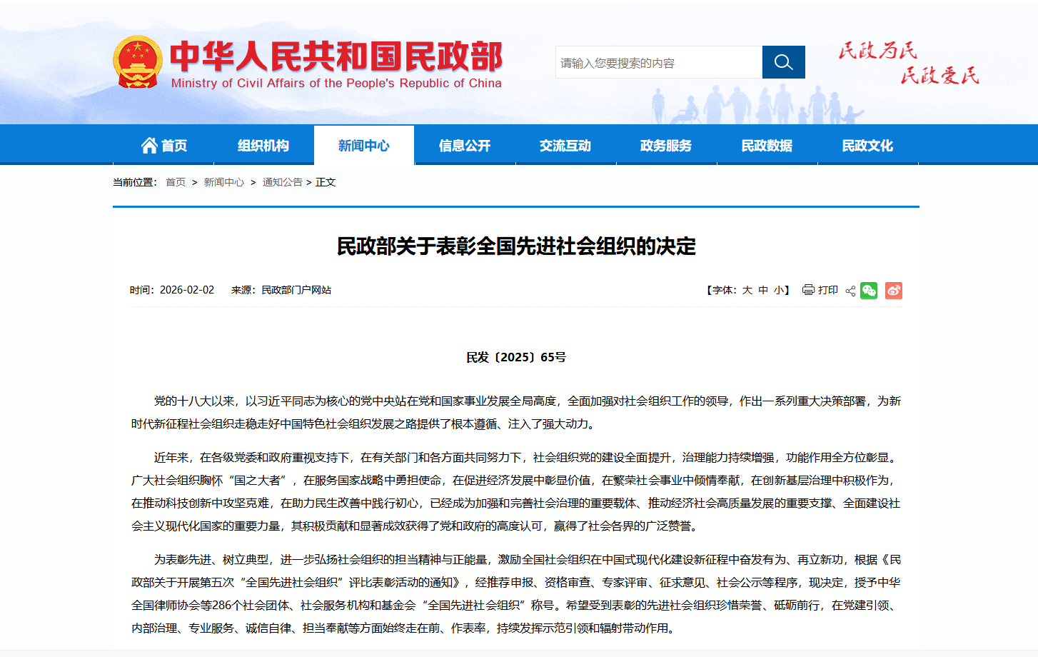 2月2日,民政部发布《关于表彰全国先进社会组织的决定》,共有286个社会团体、社会服务机构和基金会获评“全国先进社会组织”称号。中国建筑材料流通协会获评“全国先进社会组织”称号。