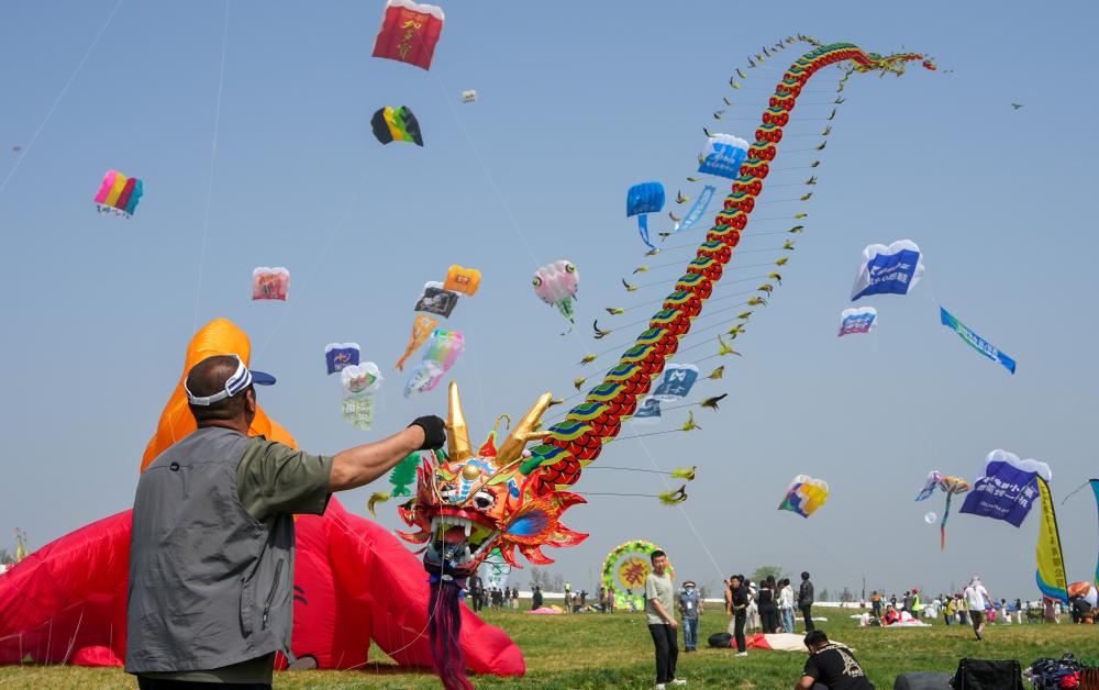 4月15日,前来参会的全球风筝选手参与了“拥抱和平”签名活动。龙头蜈蚣风筝承载着吉祥顺遂、国泰民安的美好寓意,是潍坊非遗经典。各国风筝运动员在风筝上亲笔签名,以风筝长线为纽带,共绘和平画卷。
