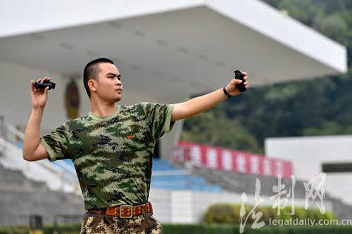 ????練兵場上空被投擲的防暴彈劃出一條條優(yōu)美的弧線?!鞍谁h(huán)、九環(huán)、十環(huán)……?!眻蟀袉T響亮的聲音響徹練兵場。班長蔡錦彬投擲的防暴彈仿佛對靶心有向心力,一環(huán)比一環(huán)高;其他官兵也不甘示弱,剛剛創(chuàng)下的好成績不斷被刷新,戰(zhàn)士廖國勇猶如賽場上的一匹黑馬,憑著過硬的實力,一路過關(guān)斬將,奪得第一。(林宇華)