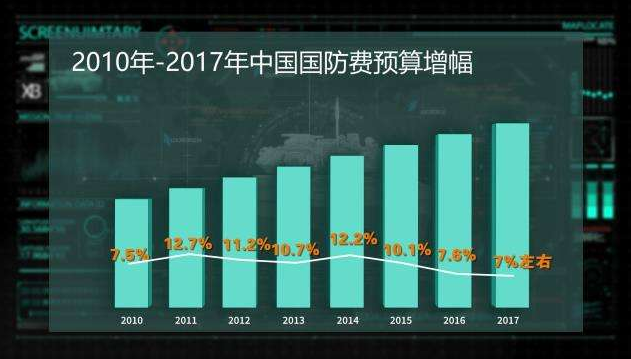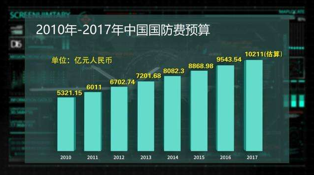 2017年3月4日,全國(guó)人大新聞發(fā)言人傅瑩在北京透露,2017年中國(guó)國(guó)防預(yù)算增幅在7%左右。