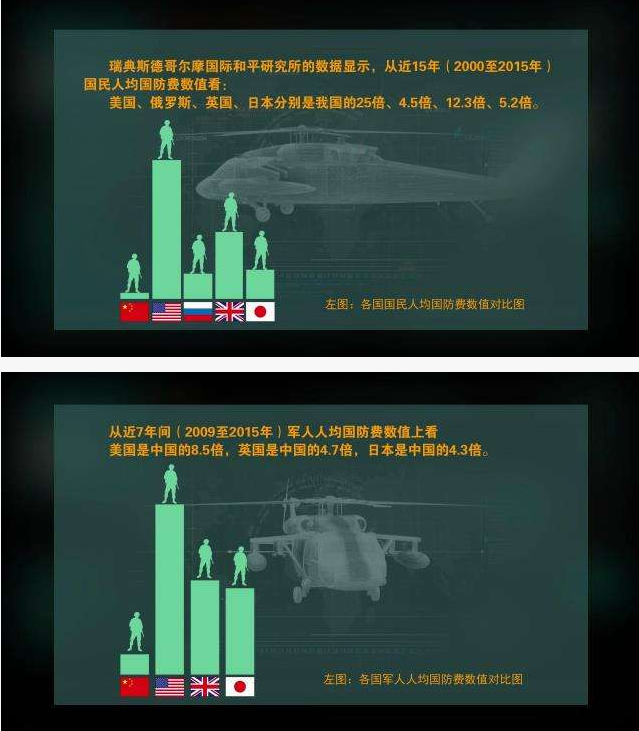 【中國(guó)人均國(guó)防費(fèi)為690元人民幣,約104美元】相當(dāng)于美國(guó)的1/18、日本的1/4、英國(guó)的1/9、法國(guó)的1/7、俄羅斯的1/5