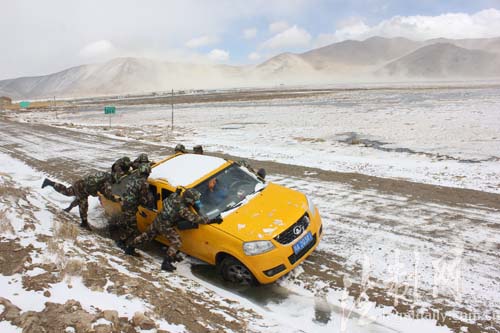 圖為西藏邊防總隊江嘎邊防派出所官兵接警后救援被困車輛