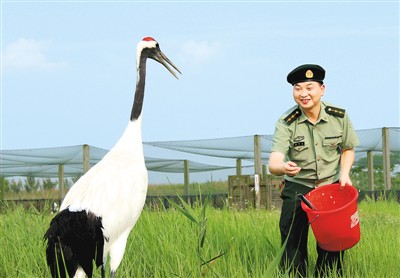 ????駐守在這里的邊防官兵主動(dòng)承擔(dān)起守護(hù)濕地生態(tài)、保護(hù)野生動(dòng)物的使命,他們?nèi)找勾┧笱策壴趶V袤的濕地。僅今年以來,該所依托“警民義務(wù)護(hù)鳥隊(duì)”、“護(hù)鳥熱線”等平臺(tái),組織官兵巡邏踏查保護(hù)區(qū)核心區(qū)域120余次,定期向丹頂鶴等各類候鳥投放玉米等飼料。同時(shí),該所深入轄區(qū)向村民宣傳《野生動(dòng)物保護(hù)法》,讓這片土地真正成為候鳥的一片樂土,獲得了保護(hù)區(qū)、駐地政府以及當(dāng)?shù)匕傩盏馁澴u(yù),邊防官兵們被親切地稱作候鳥“守護(hù)神”。圖為官兵喂食丹頂鶴。(童瑞金 耿建平)