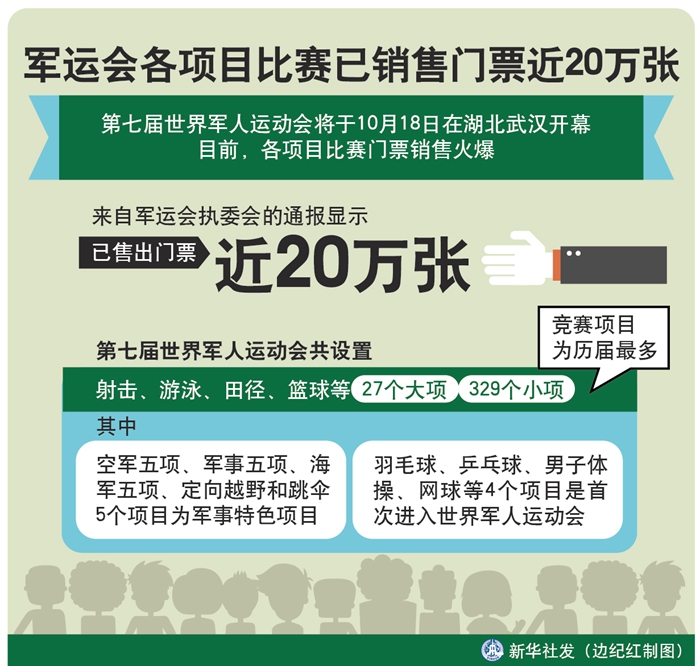 新華社武漢10月16日電(記者梁建強(qiáng))第七屆世界軍人運(yùn)動(dòng)會(huì)將于18日在湖北武漢開(kāi)幕。目前,各項(xiàng)目比賽門(mén)票銷(xiāo)售火爆。來(lái)自軍運(yùn)會(huì)執(zhí)委會(huì)的通報(bào)顯示,已售出門(mén)票近20萬(wàn)張。