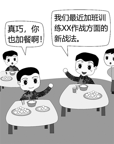 ????“真巧,你也來加餐啊?!薄笆前。覀儬I(yíng)最近在研訓(xùn)新戰(zhàn)法,有時(shí)會(huì)加班訓(xùn)練……我跟你說,我們研究的新戰(zhàn)法主要是××作戰(zhàn)方面,據(jù)說要在全旅推廣呢!”