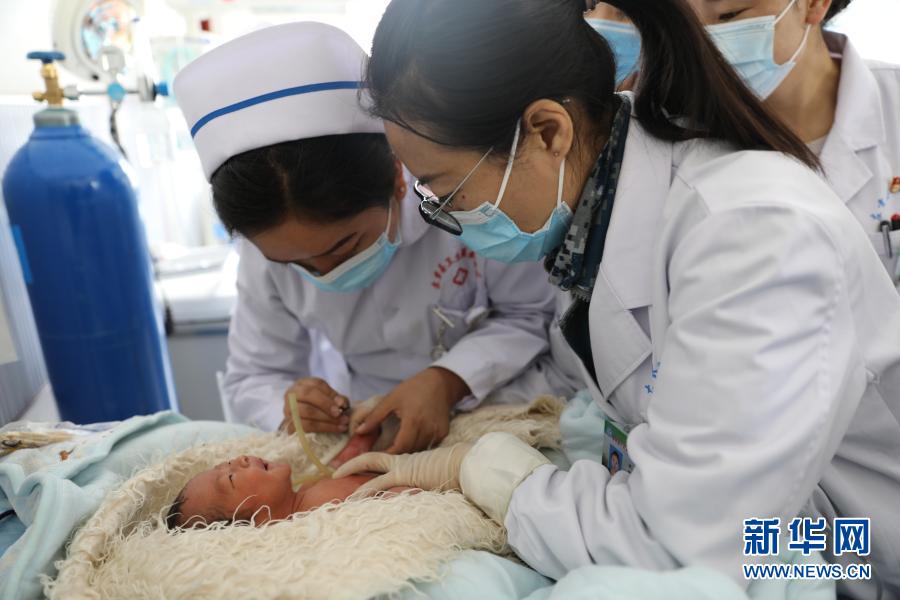 在新生兒病房,空軍特色醫(yī)學(xué)中心援藏醫(yī)療隊隊員(右)帶教左貢縣人民醫(yī)院醫(yī)護人員(左)實施靜脈穿刺(7月17日攝)。新華社發(fā)(張洪濤 攝)