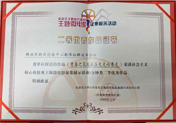 ????第四屆社會主義核心價值觀主題微電影征集展播活動評選結(jié)果日前揭曉,解放軍新聞傳播中心新華社解放軍分社申報的《青春之花綻放在克克吐魯克》獲“3分鐘類二等優(yōu)秀作品獎”。