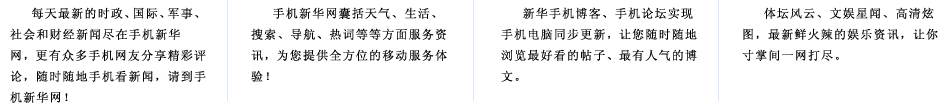 手機(jī)新華網(wǎng)是新華網(wǎng)的手機(jī)無(wú)線門(mén)戶(hù)網(wǎng)站,是中國(guó)最具權(quán)威的免費(fèi)手機(jī)新聞網(wǎng)站之一。歡迎各地電信運(yùn)營(yíng)商以及廣告界、企業(yè)界、商務(wù)界、傳媒界等各界人士與我們聯(lián)系,精誠(chéng)合作,實(shí)現(xiàn)共贏。電話:010-63070908,E-mail:xhsjb@xinhuanet.com