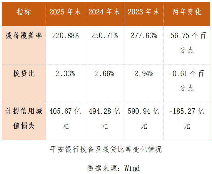 国信证券金融业首席分析师王剑分析称,整体看,平安银行2025年末拨备覆盖率同比下降约30个百分点,年末拨贷比同比下降0.33个百分点。随着贷款结构持续调整,其资产质量压力有所减轻,但拨备计提方面仍存一定压力。
