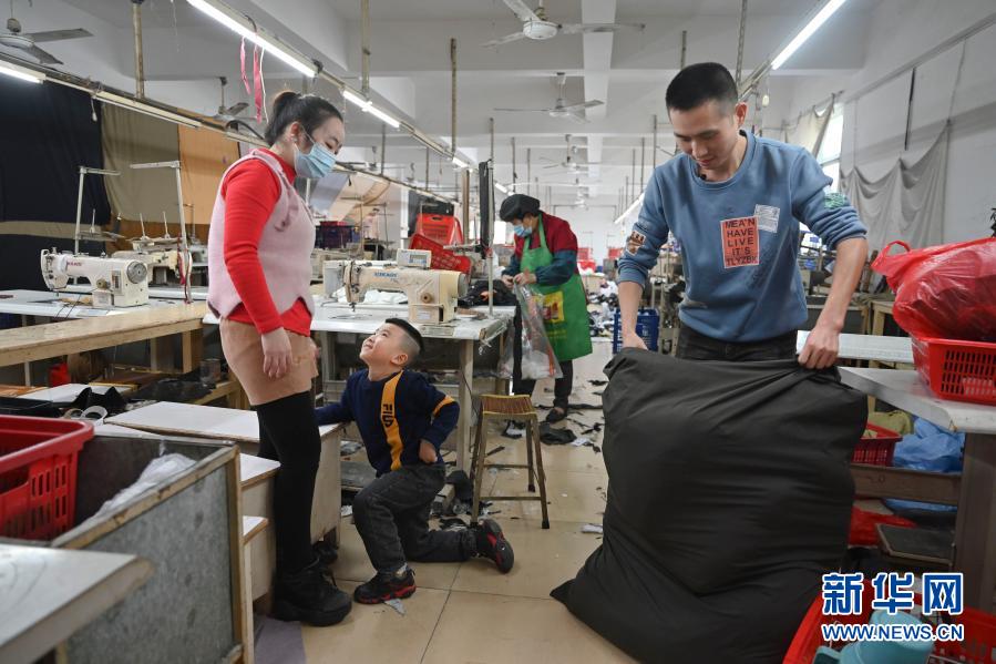1月26日,在福建省石獅市的金利萊斯服裝廠,黃海龍?jiān)谑帐皽?zhǔn)備寄給老家親人的自制枕頭等禮物,聰聰在一旁纏著媽媽玩耍。