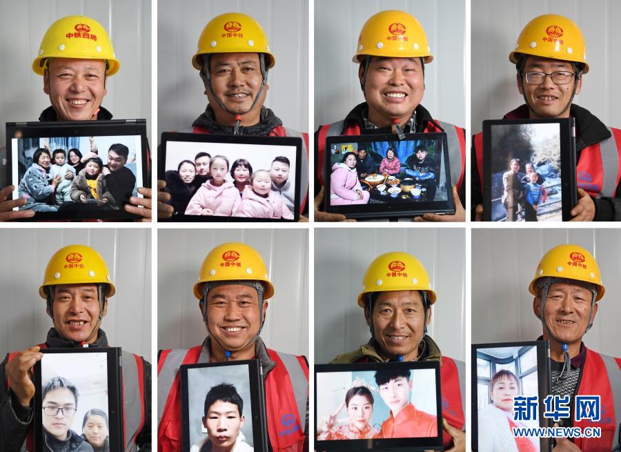 這是中鐵四局建筑工人們與家人照片的同框合影(2月4日攝,拼版照片)。