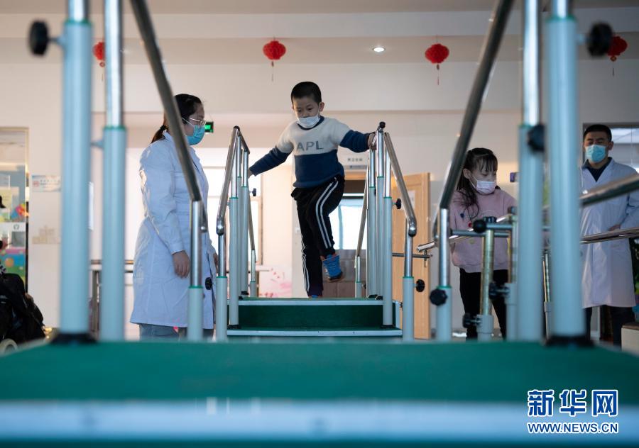 在哈爾濱博能中醫(yī)門診部,劉雨晴(左一)為腦癱兒童進行康復訓練(2月2日攝)。