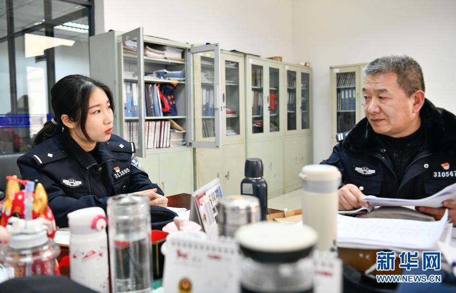 2月11日,在天津市紅橋區(qū)芥園派出所,楊曉惠向社區(qū)老民警請(qǐng)教問(wèn)題。新華社發(fā)(孫凡越攝)