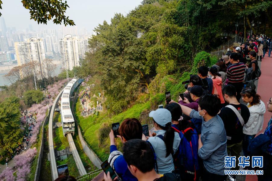 2月23日,在重慶軌道交通2號(hào)線佛圖關(guān)段,游客在山城步道上拍攝穿越花海的單軌列車。