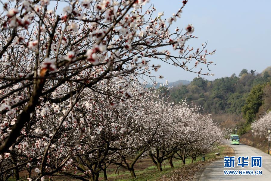 3月2日,一輛觀光車在蘇州上方山國(guó)家森林公園內(nèi)開(kāi)滿鮮花的小道上前行 。新華社發(fā)(杭興微 攝)