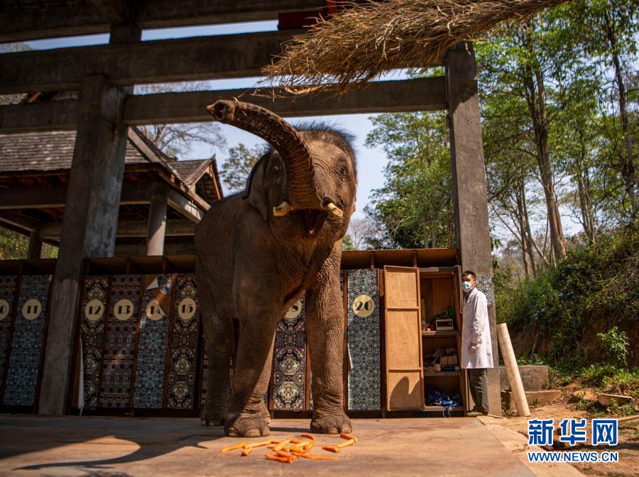 “象爸爸”為一頭名叫“小強(qiáng)”的大象測(cè)量體重(3月6日攝)。新華社記者 江文耀 攝