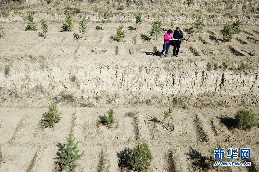 3月11日,在平?jīng)鍪嗅轻紖^(qū)白水鎮(zhèn)焦莊村北山,張文玉(左)和同事討論植樹造林細節(jié)(無人機照片)。