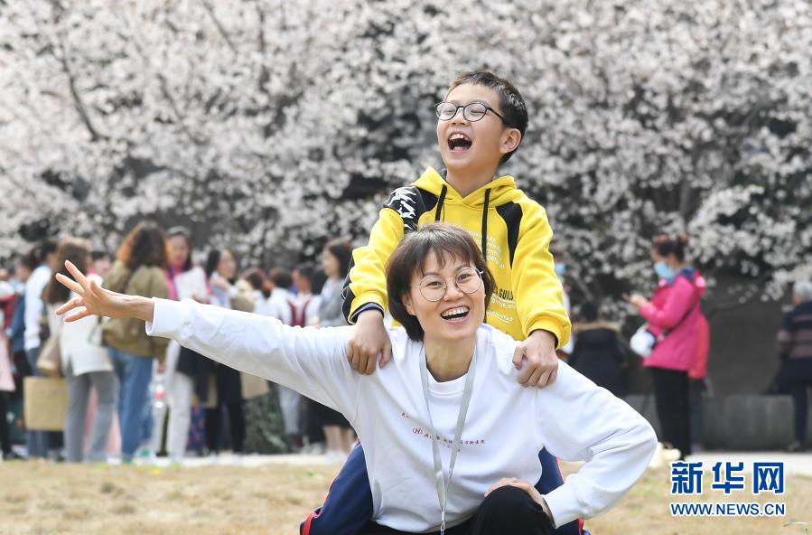 3月13日,廣東援鄂醫(yī)療隊(duì)成員梁仕鳳帶著孩子來到武漢大學(xué)賞櫻游玩。新華社記者 程敏 攝