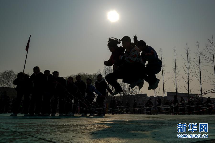 騎路小學(xué)的學(xué)生們?cè)诖笳n間練習(xí)“大網(wǎng)繩跳”(3月10日攝)。