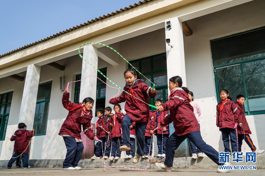 騎路小學(xué)的學(xué)生們?cè)谡n間練習(xí)跳繩(3月10日攝)。新華社記者 李博 攝
