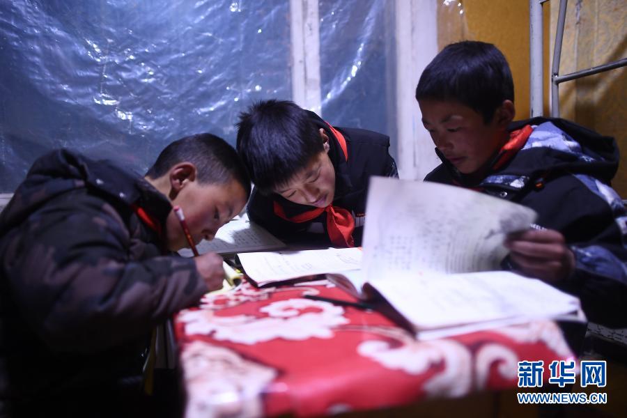 3月16日,在索加鄉(xiāng)寄宿小學(xué),羅松東丁(中)和小伙伴在宿舍內(nèi)溫習(xí)功課。新華社記者 張宏祥 攝