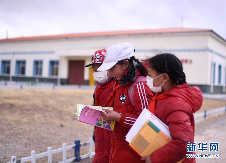 3月16日,在索加鄉(xiāng)寄宿小學(xué),晚餐結(jié)束后,青梅才吉(中)和同學(xué)在校園內(nèi)。新華社記者 張宏祥 攝