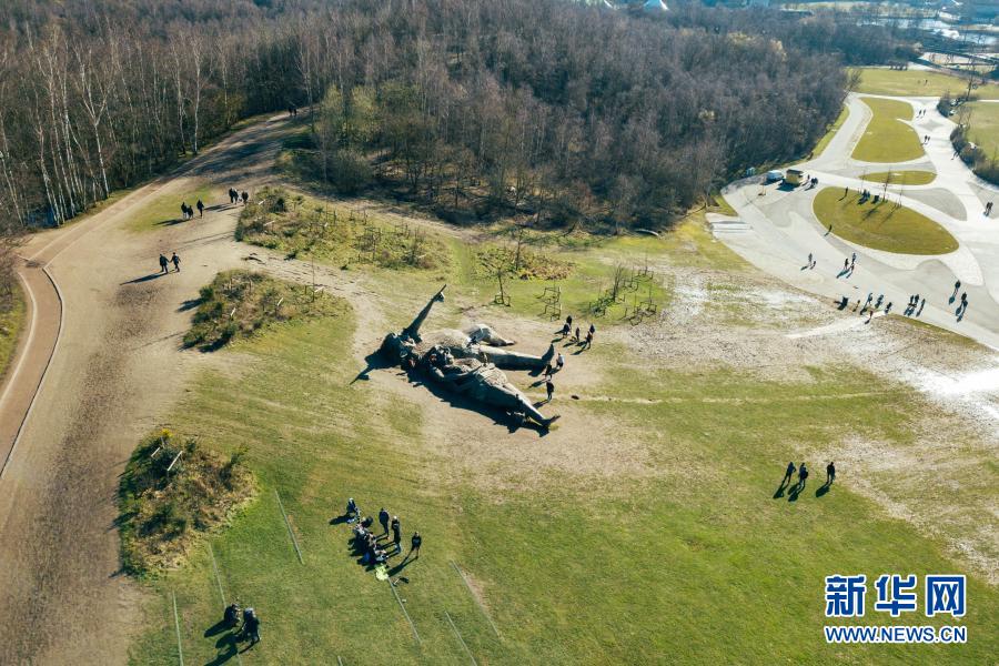 這是3月20日在比利時博姆市的德舒爾森林公園拍攝的“巨人”雕塑(無人機(jī)照片)。新華社記者 張鋮 攝