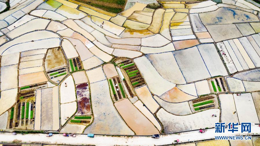 3月24日,廣西河池市東蘭縣武篆鎮(zhèn)色故村農(nóng)民在田間勞作(無人機照片)。