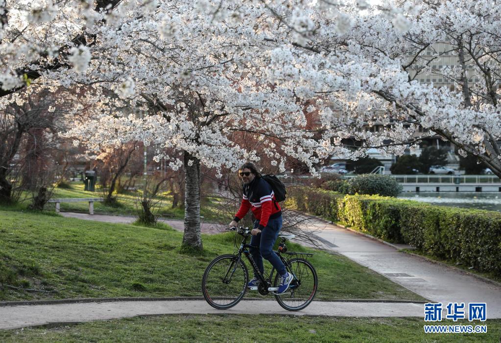 3月24日,市民騎車從意大利首都羅馬盛開的櫻花樹下經(jīng)過。新華社記者 程婷婷 攝