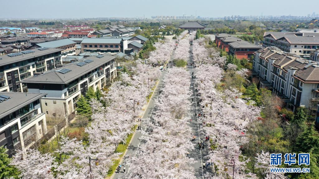 3月26日拍攝的江蘇省揚州市鑒真路“櫻花大道”(無人機照片)。